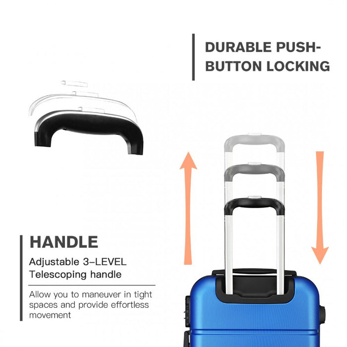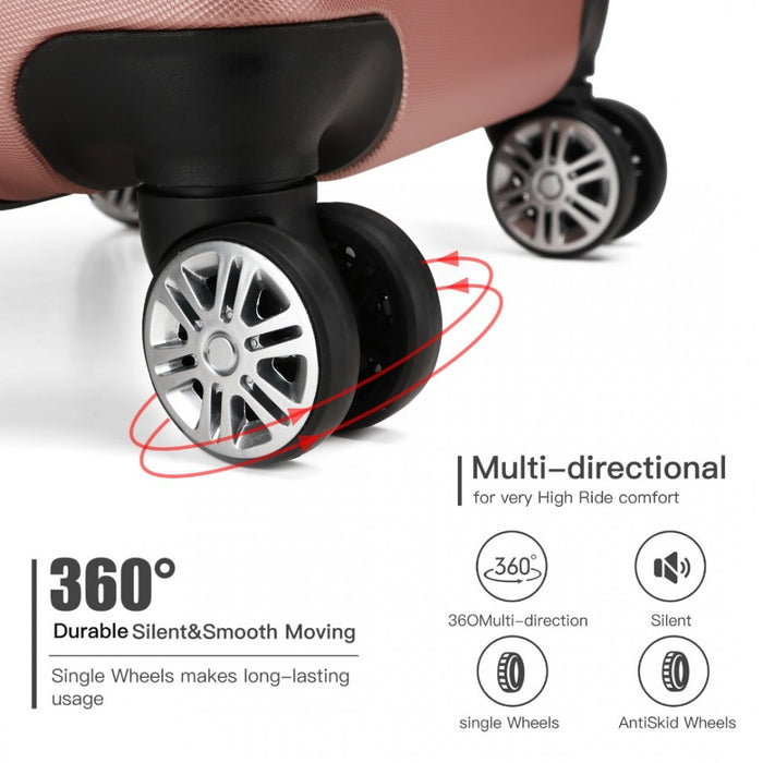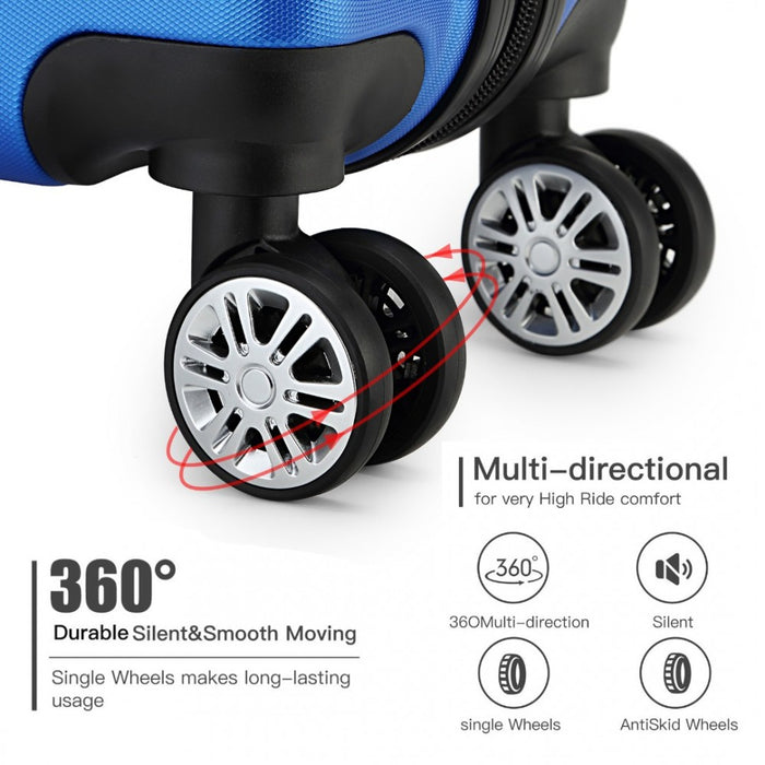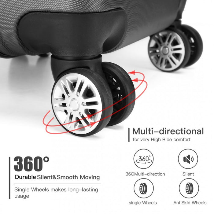Features: 4 x 360 °swivel wheels distribute the weight of your suitcase evenly and ensure easy gliding through busy airports or train stations. Retractable, easy grip telescopic handle with two height settings. A fixed 3 dial combination lock to offer maximum security. There are two normal handles - one on the top and one on the side. Four plastic feet on the side to rest the bag on. The main compartment features nylon elasticised straps with a buckle that can secure the contents on one side, the other side is secured via a zip making for organised packing.