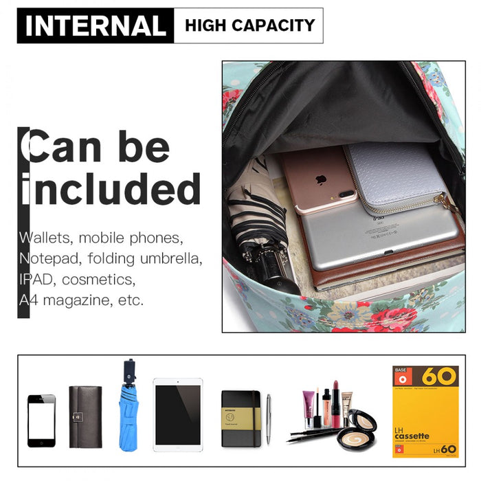 Material: 700D Polyester / Printed Cotton Canvas Inner lining: polyester Lightweight, strong and durable Wipe clean only with a damp cloth. Size: 38cm (H) 35cm (W) 17cm (D) / 13.8" (H) 13.8" (W) 6.7 (D) Weight: 0.4kg All meaurements are external, internal measurements may differ by approx 1-2cm. Large enough to accomodate A4 items and 13.3 inch laptops. Plenty of room for your essentials: phone, purse, and keys. Also enough space for a number of notepads, books and your diary. All tablet devices will fit comfortably within the backpack. A compact umbrella, which is a staple in the ever changing weather, will fit perfectly inside the backpack along with your water bottle and any other refreshements.