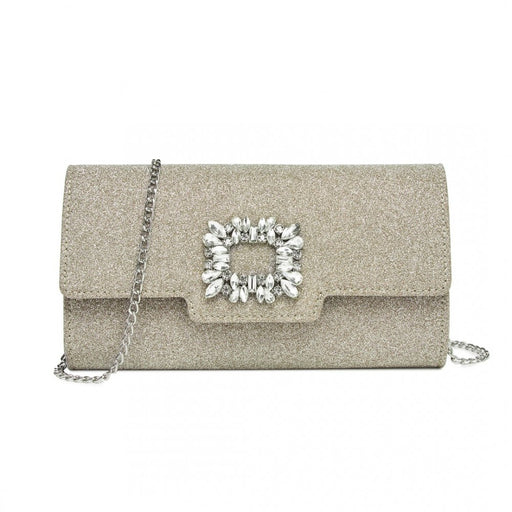Ver todos los detallesCLM2461 - Miss Lulu Glitter Evening Clutch with Crystal Embellishment & Detachable Chain Strap - Elegant Crossbody or Handheld Bag - Gold