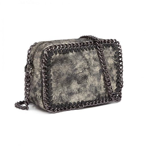 Take your look to the next level with this distressed, metallic PU leather shoulder bag. The gunmetal linked chain border and shoulder strap will a...