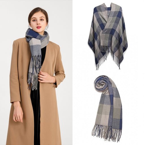 S6430 - Women Fashion Long Shawl Grid Tassel Winter Warm Lattice Large Scarf - Grey