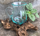 The glass is hand-blown and while still hot it is then relaxed over a piece of Gamal root, the glass then hardens to the shape of the wood ensuring a perfect fit. They are crafted using a natural product by using hand tools in the traditional Balinese way. It provides a one-of-a-kind setting for stones and air plants, cut flowers or a wine decanter.